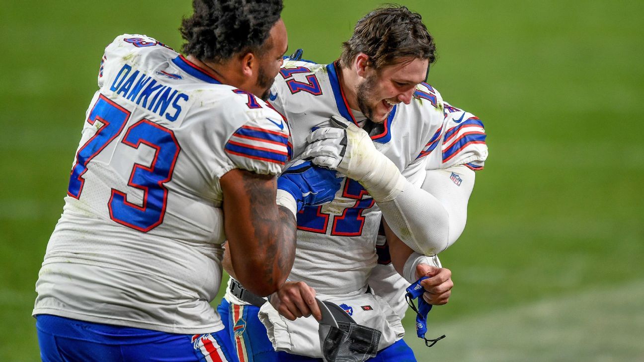 “He’s special; this is a special group,” Dawkins said after Buffalo’s first-round playoff win against the Indianapolis Colts, when Allen passed for 324 yards. “Josh is almost like a character on Madden — a 99 overall. He just keeps doing it week in and week out. I’m happy to call him my quarterback and I’m happy to block for him.”