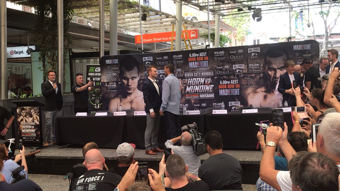 Anthony Mundine’s trash talk went on for a while at today’s press conference and it certainly didn’t stop when he and Jeff Horn faced off in front of fans.