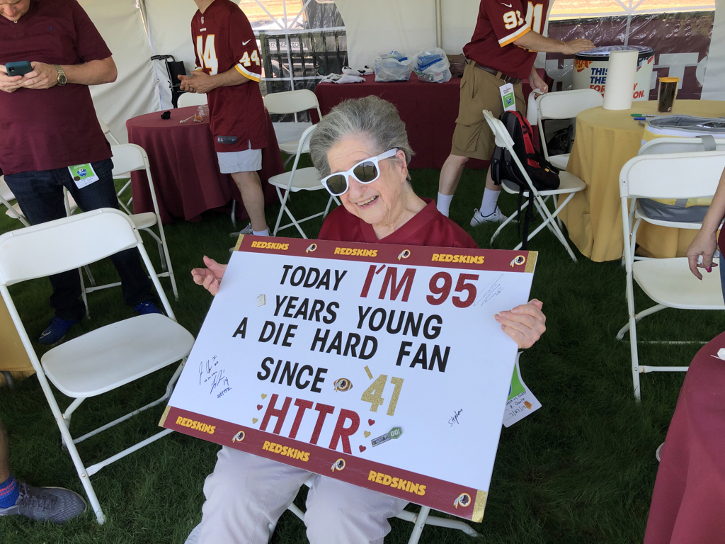 For the sixth straight year, Melba Jacobson of Silver Spring, Md., celebrated her birthday at Redskins training camp. She was in a tent at the opposite end from where the players exit but she still got autographs from several Redskins: Trey Quinn, Case Keenum and Jehu Chesson. Jacobson was reared in Texas but made it clear: She’s a longtime Redskins fan.