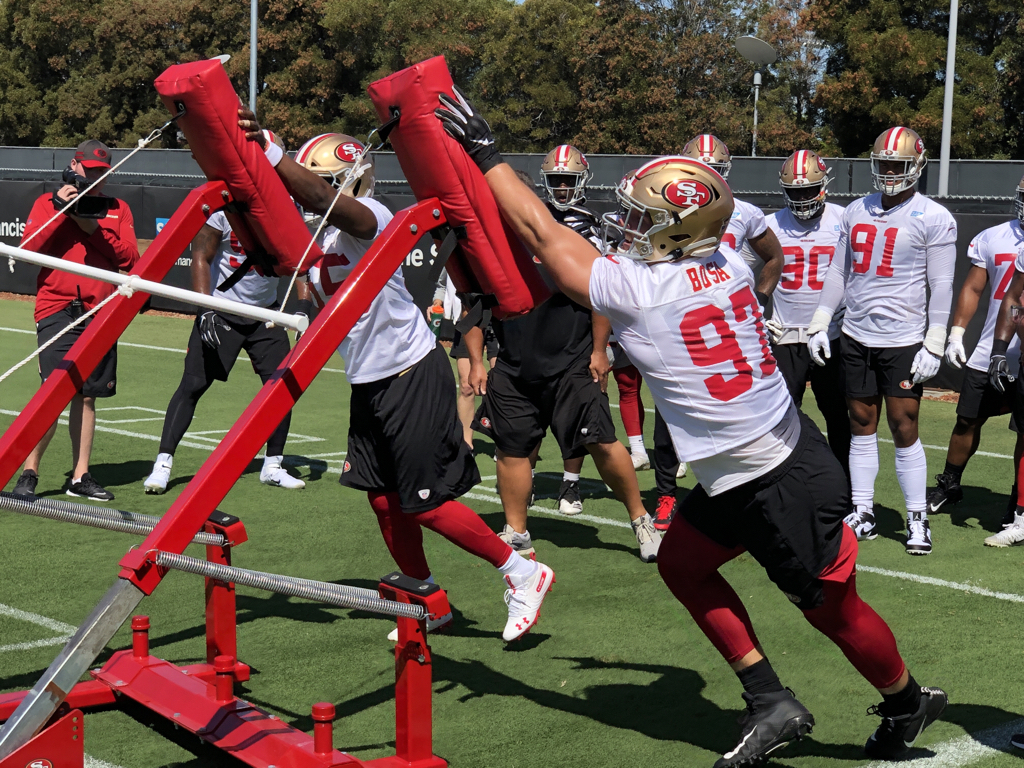 49ers DE Nick Bosa, signed and in camp on time, went through his first training camp practice as a pro on Saturday. Bosa worked mostly with the second team but also got some reps with the starters in third down packages. Bosa had some good reps against LT Joe Staley, though the Niners won’t be in pads until Monday. Here, Bosa and edge partner Dee Ford get some sled work in. Much is expected of these two this season.