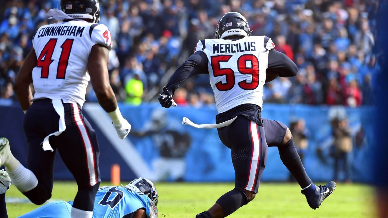 Mercilus now has two interceptions this season. He did not have an interception in his first seven NFL seasons. According to ESPN Stats & Information powered by NFL Next Gen Stats, Mercilus hit a max speed of 17.96 mph on the return. Smith made the tackle and during the runback, he reached a max speed of 20.93 MPH — the second-fastest speed by a tight end on any play this season.