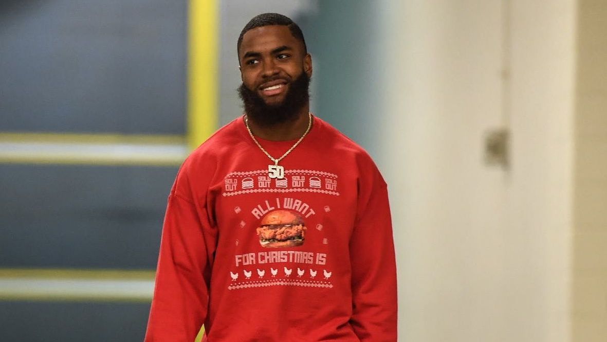 Kenjon Barner shows off his love for modern holiday classic “Elf” with festive socks: