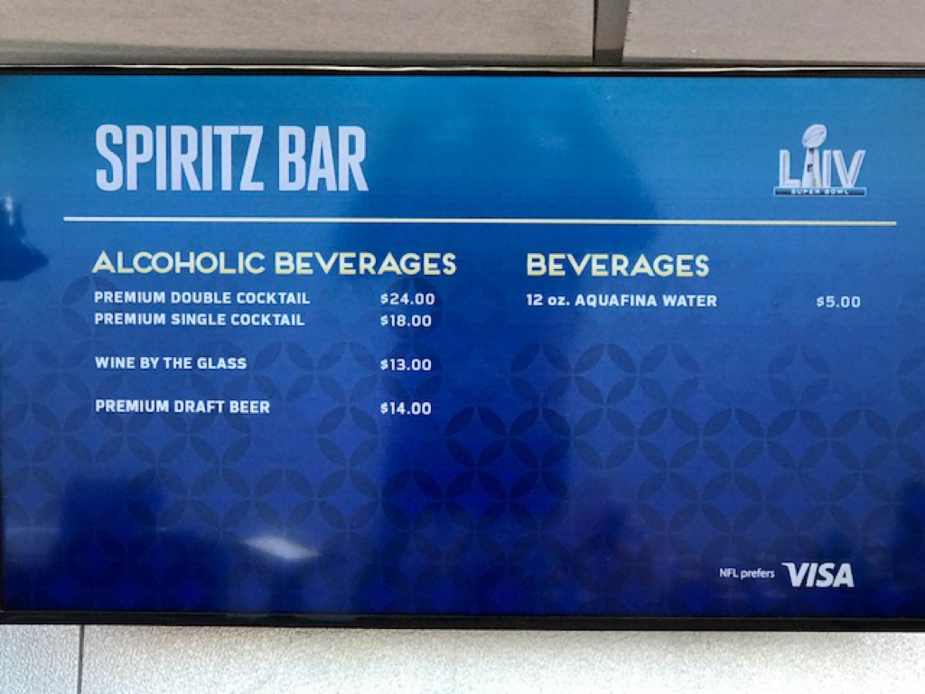 A premium cocktail or a glass of wine at the Super Bowl ranges anywhere from $13 to $24.