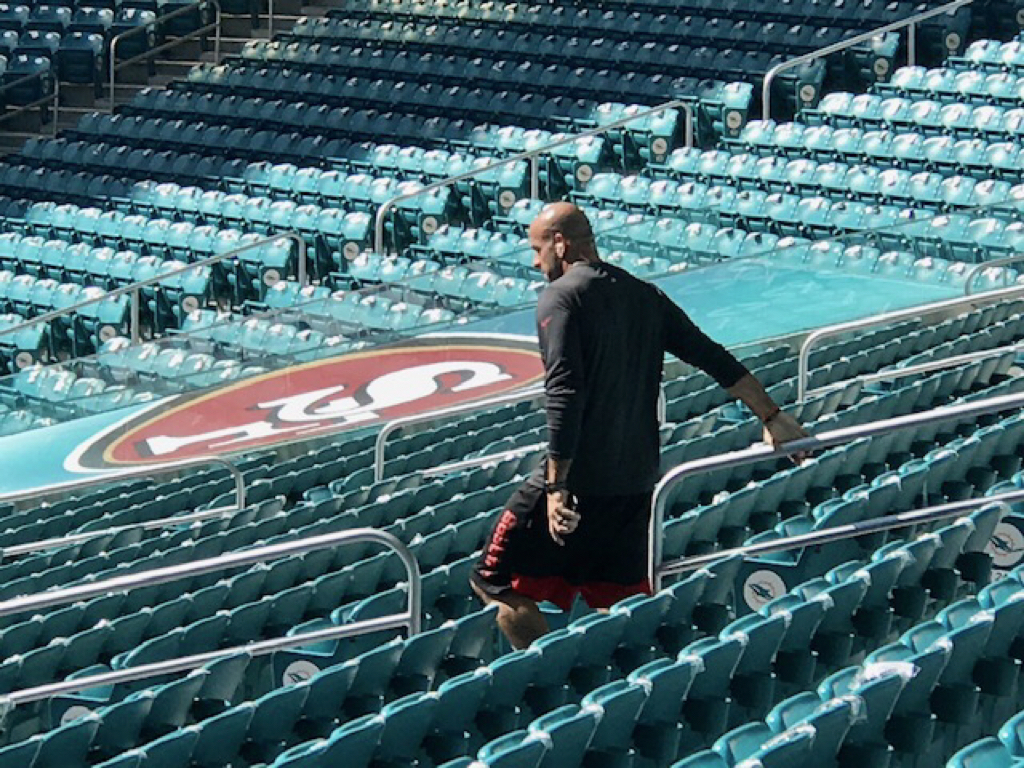 Just ran into Niners defensive coordinator Robert Saleh who is running stairs to get in quick workout before Super Bowl LIV. “Just trying to run off some steam, man.”