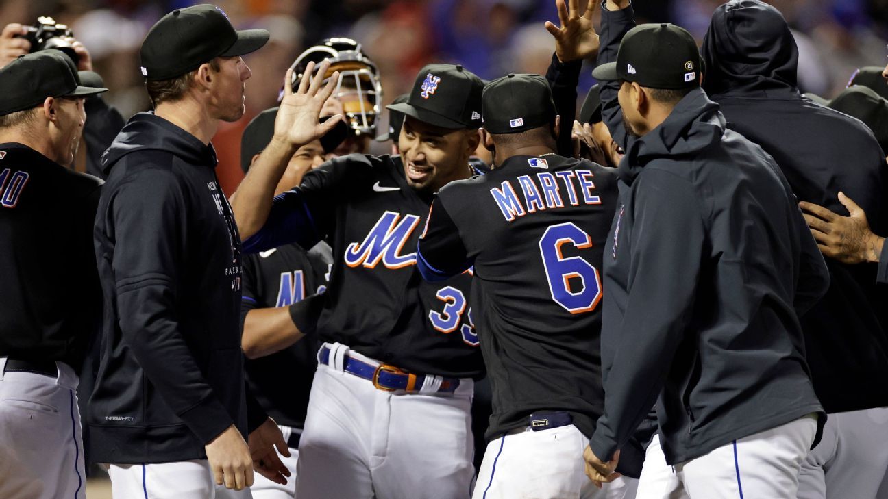 The Mets poured on to the field and mobbed Diaz after the final out as a graphic picturing the five pitchers with the words “BLACK OUT” showed on the scoreboard.