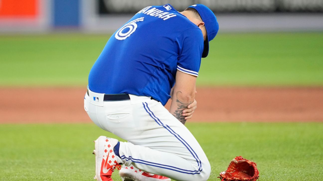 Schoop’s one-hopper deflected off Manoah to shortstop Santiago Espinal, who made the out at first as Manoah walked off the back of the mound, grimacing in pain.
