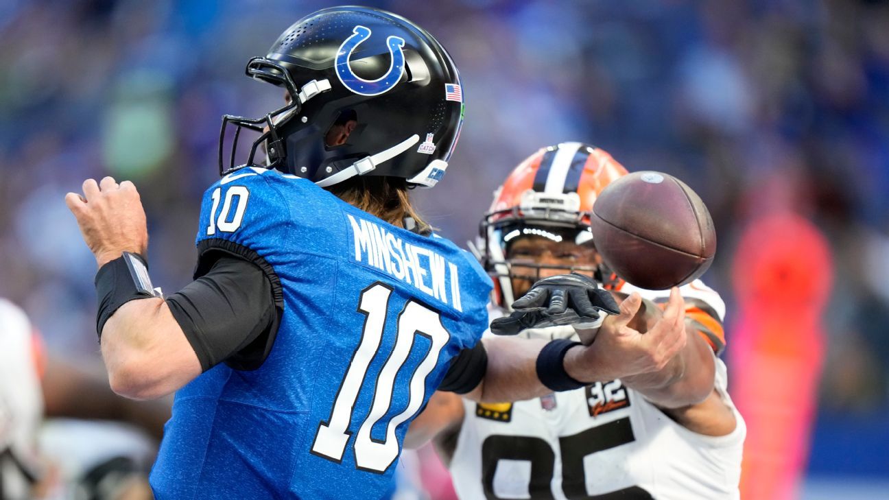INDIANAPOLIS — Cleveland Browns defensive end Myles Garrett is having himself a game. Toward the end of the first half Sunday, he stripped Indianapolis Colts quarterback Gardner Minshew in the end zone, leading to a Browns touchdown and 24-21 halftime lead.